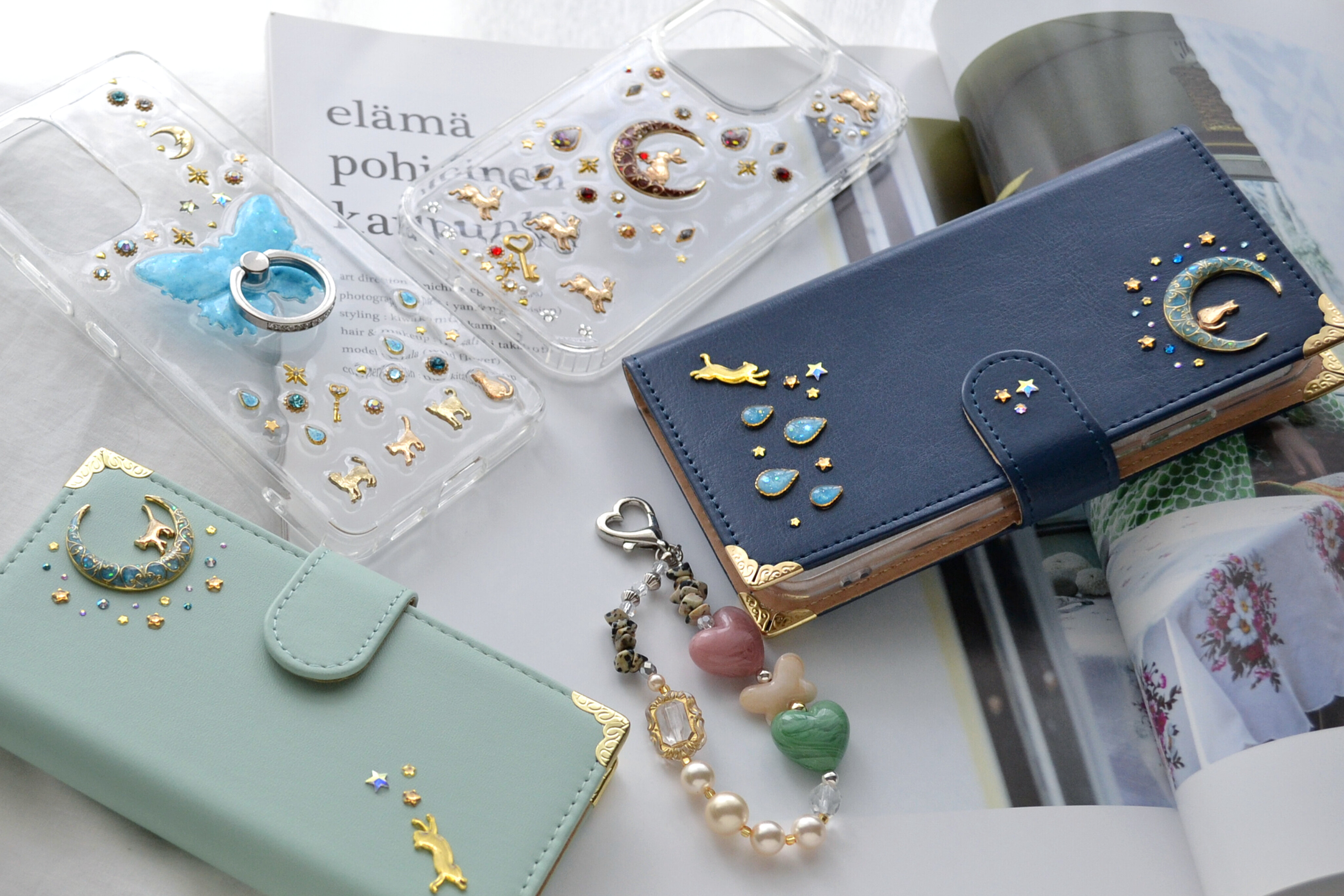手帳型スマホケース『月の宝石群』手元をきらめくスマホカバー専門店 あたたかなオレンジ ほぼ全機種対応